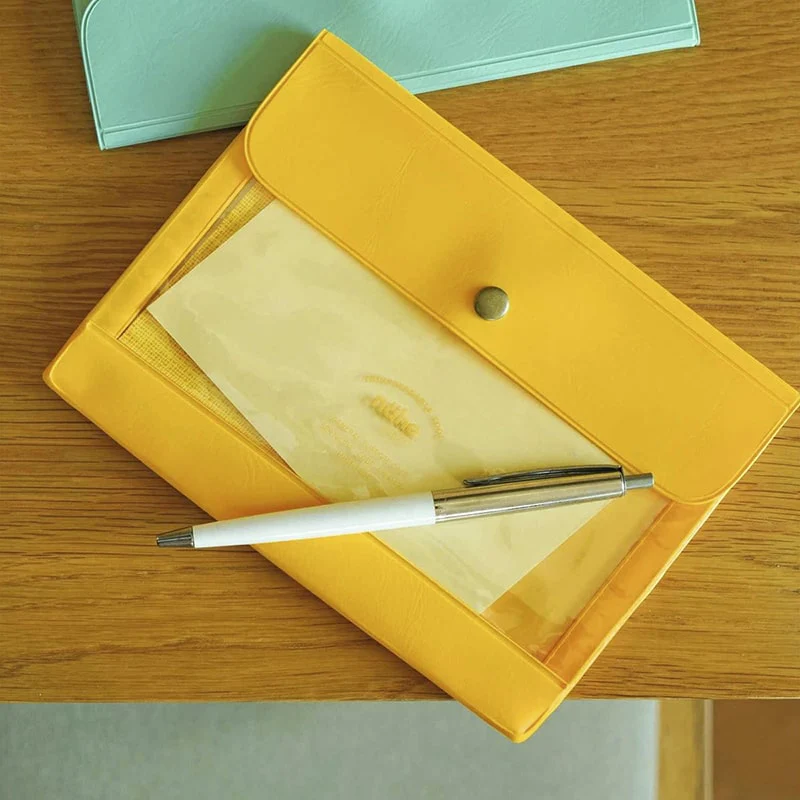 - Funda de plástico de tamaño A6 con compartimentos interiores y exterior.